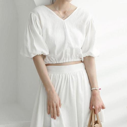 핫핑 폴링러브 캡소매 반팔 셔링리본 핀턱 코튼 블라우스