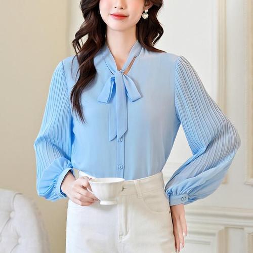 어깨 레이스 셔링 퍼프 소매 긴팔 블라우스 블라우스 여성 셔츠 퍼프 남방 리본 레이스 오피스룩