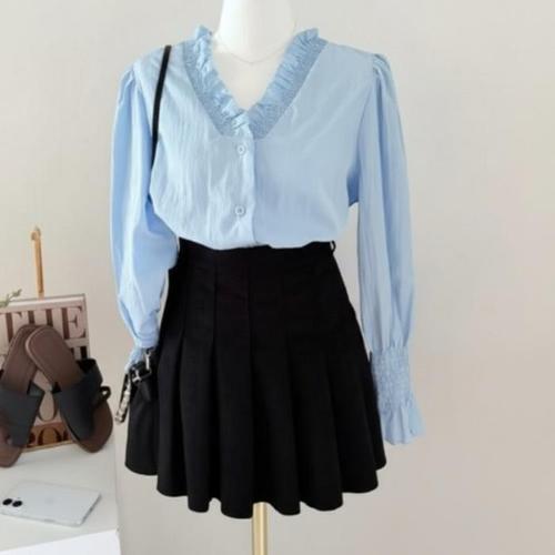 [신상오픈런]여성 루즈핏 프릴넥 셔링 퍼프 소매 긴팔 블라우스 (46199342)