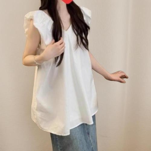 화이트 프릴 이중소매 여성 반팔 블라우스 여름 코튼