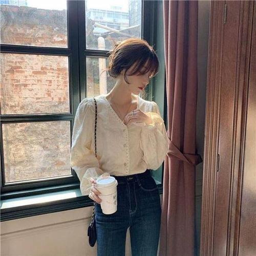 [다잇템_패션]여성 소매 프릴 귀여운 V넥 블라우스