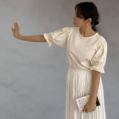 [옷자락] 여성 면 소매 밴딩 프릴 무지 색상 블라우스 티셔츠