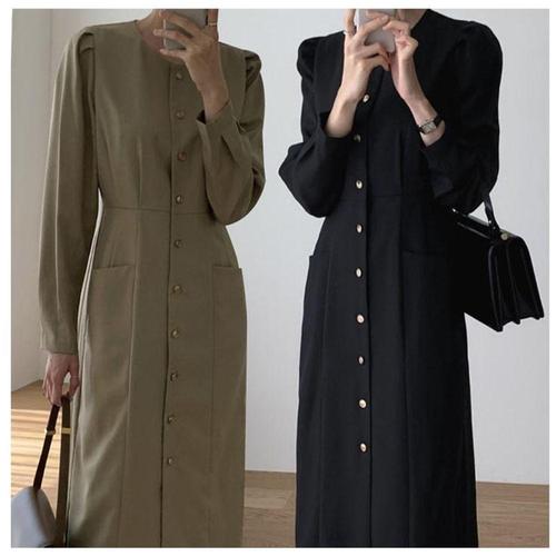 [오너클랜]인기상품 여성 고급 정장 하객룩 핀턱 버튼 퍼프 소매 롱 원피스 [WFLKASZ_260302]