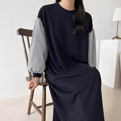 [신상오픈런]여성 스트라이프 퍼프 소매 배색 리본 롱 원피스 빅사이즈 (45899407)