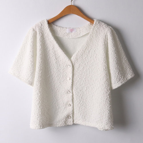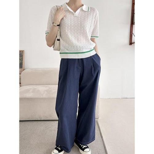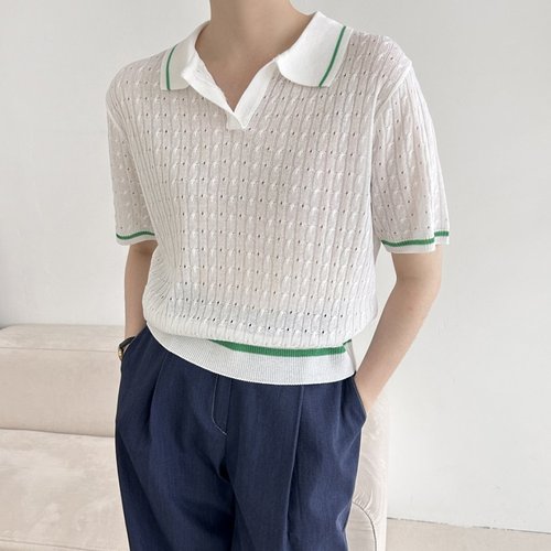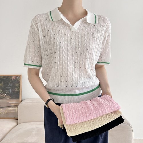 루이국산 여성 카라넥 레귤러핏 꽈배기 반팔 니트티 21DS-WKN-3509-화이트