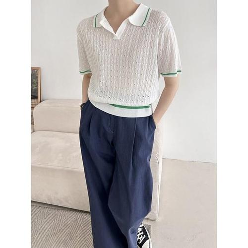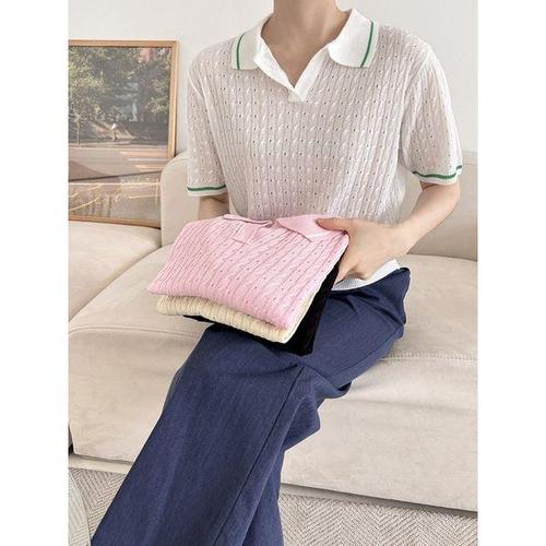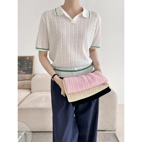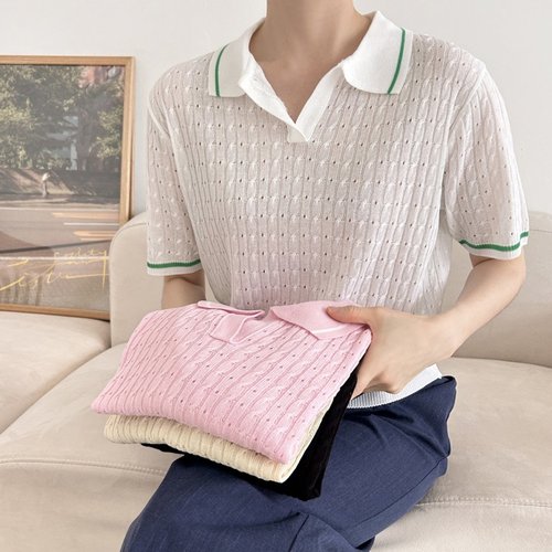 [샵앤]루이 국산 여성 카라넥 레귤러핏 꽈배기 데일리 반팔 니트 티셔츠 21DS-WKN-3509-화이트