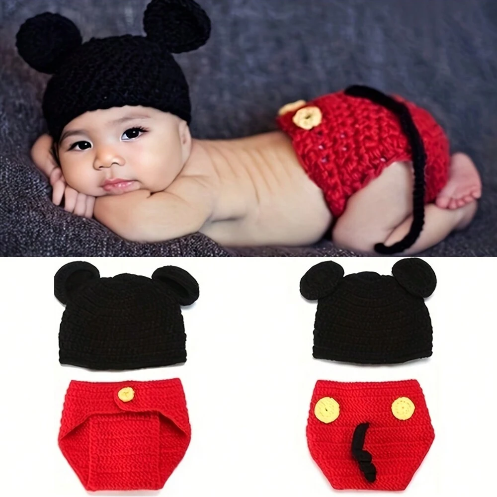 신생아 사진 의상 수제 니트 만화 동물 미키 코스튬 점프 슈트, 이어 캡 모자, 전체 롬퍼 의류