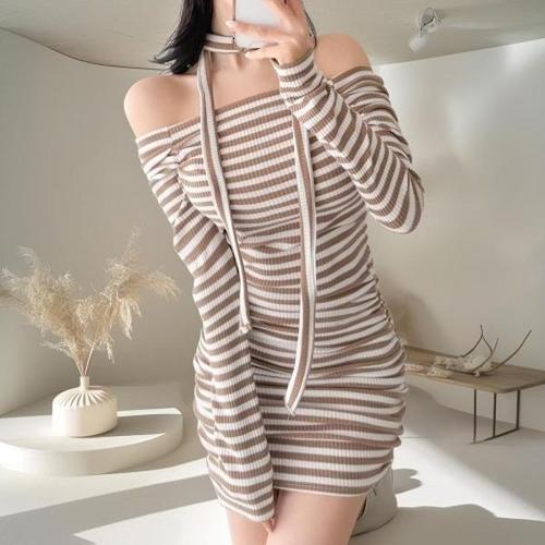 [다잇템]여성 콘트라스트 홀터 슬림 볼드숄더 원피스