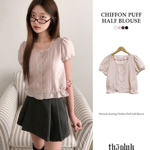 더핑크 / 뷔르 핀턱 셔링 쉬폰 퍼프 반팔 블라우스