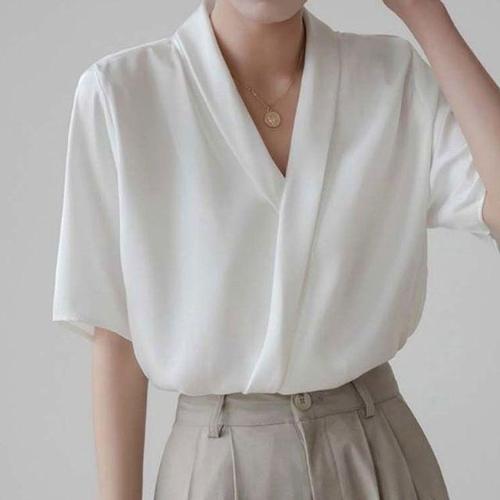 [오너클랜]인기상품 여성 오피스룩 쉬폰 셔츠 은은한 광택 반팔 랩 블라우스 [WFLN372_260210]