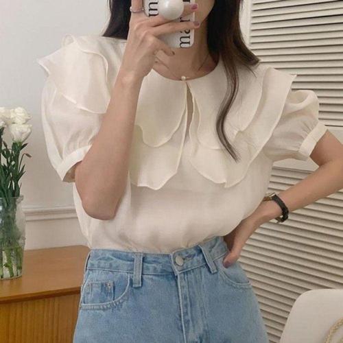 [오너클랜]인기상품 여성 여름 쉬폰 레이스 빅카라 반팔 블라우스 셔츠 [WFLL046_260304]