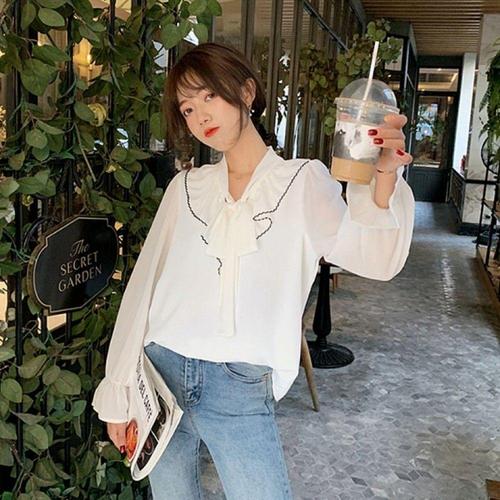 [오너클랜]인기상품 여성용 쉬폰 긴팔 리본 블라우스 프릴 데일리 티셔츠 [WFLKZMV_260304]