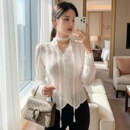 [다잇템][다잇템] 여자 페미닌 보우 V넥 비침 시폰 블라우스_24544866_588872