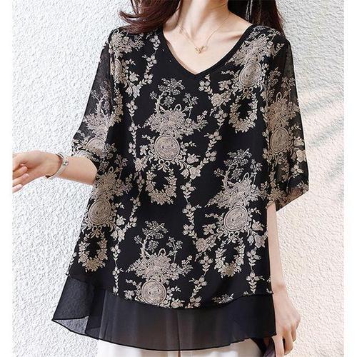 besteffie 봄 가을 중년여성 쉬폰 브이넥 루즈핏 플라워 잔꽃패턴 빅사이즈 엄마옷 롱 여자블라우스 C15