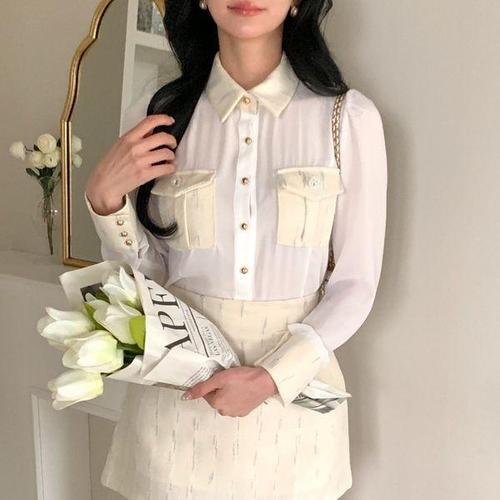[옷자락]여자 하객룩 콩단추 투포켓 배색 카라넥 쉬폰 블라우스