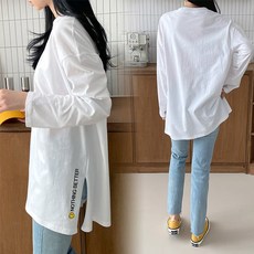 옆 트임 스마일 긴팔 티 여성 빅사이즈 오버핏 박시 포인트 티 루즈 66-110