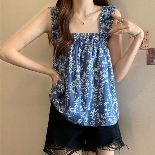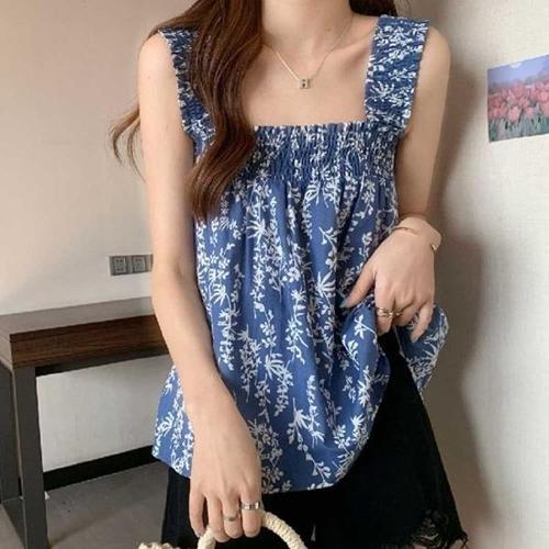 아이엠몽 여성용 통기성 플린 플라워 스모크 밴딩 크롭 민소매 티셔츠