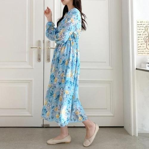 cammello 꽃무늬 롱원피스 빅사이즈 스모크 옆트임 드레스