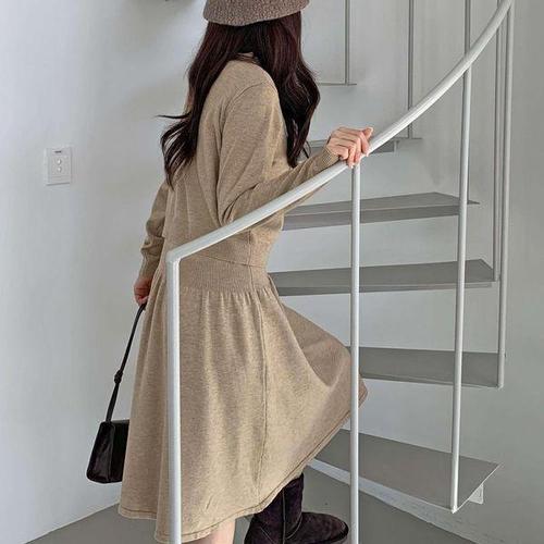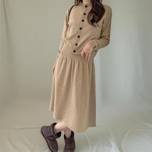 [신상오픈런]여성 스모크 롱 원피스와 단추 가디건 세트