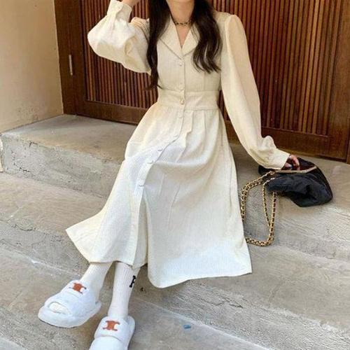 [셀러허브_여성트랜드패션]여성 날씬 롱원피스 카라넥 뒷밴딩 코듀로이원피스