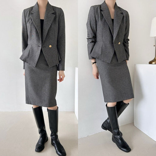 겨울 투피스 세트 모직 치마 셋업 하객룩 크롭 재킷 플리츠 여성 데일리 그레이 롱 스커트