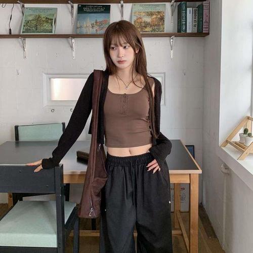 [신상오픈런]여성용 면 스판 골지 캡내장 버튼 스퀘어넥 크롭 나시탑