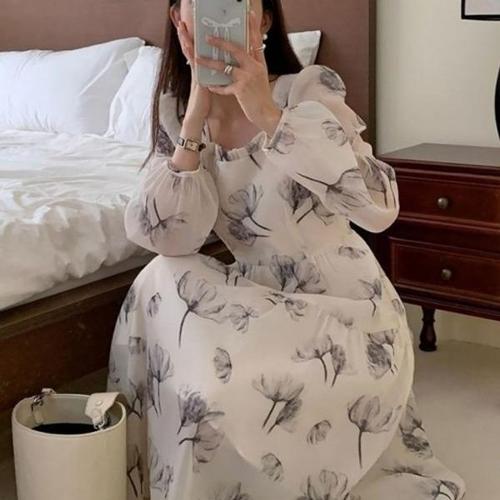 [엄지척]소매 여자 셔링 원피스 플라워 여름 롱 스퀘어넥 퍼프_19951659_667501