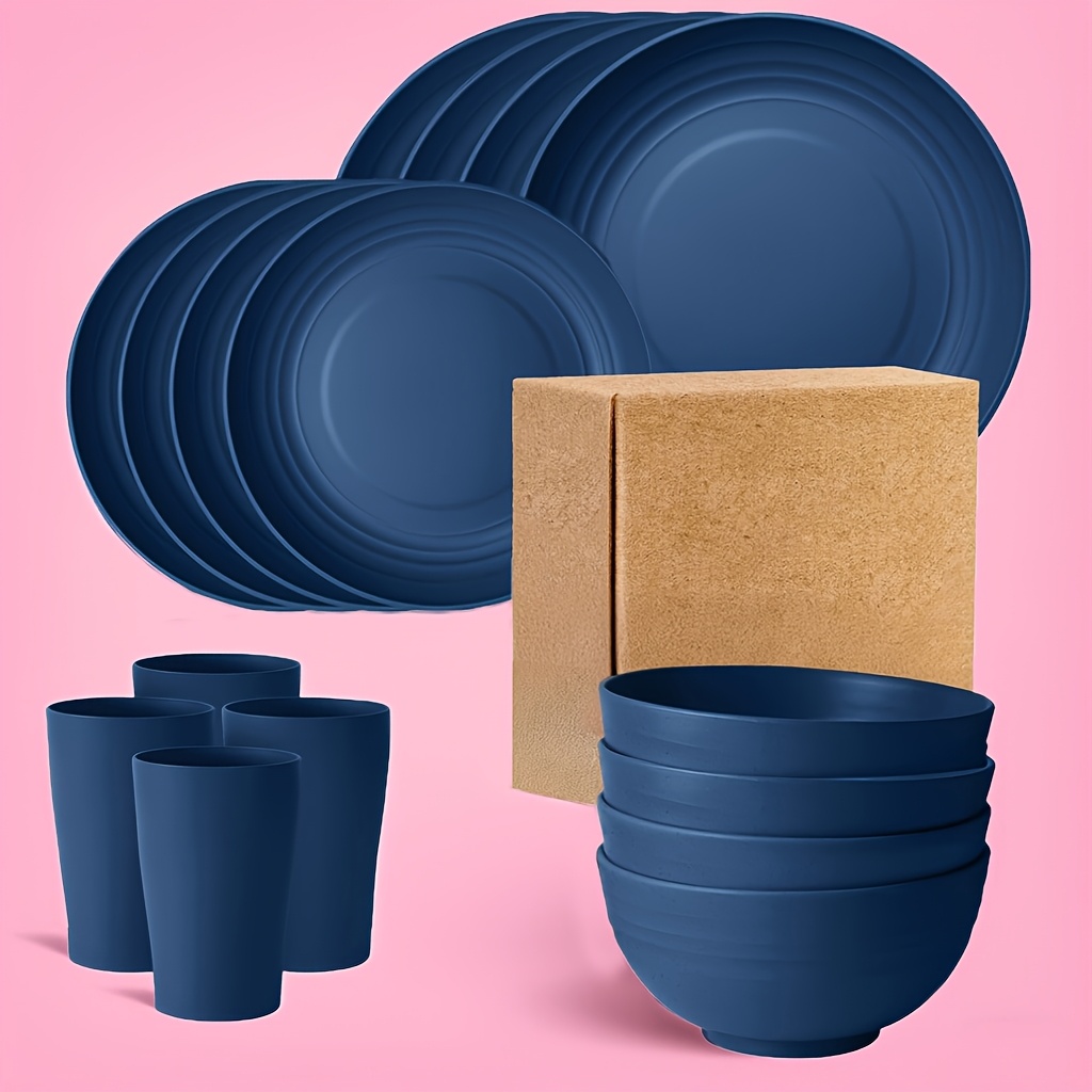 TEMU 4인용 블루 식기 세트, 접시, 그릇, 컵으로 구성되어 있으며, 전자레인지 안전 및 식기 세척기 친화적입니다. 크리스마스, 새해, 데이, 주방 사용, 야외 캠핑, RV 여행, 피크닉 등 다양한 상황에 적합합니다.