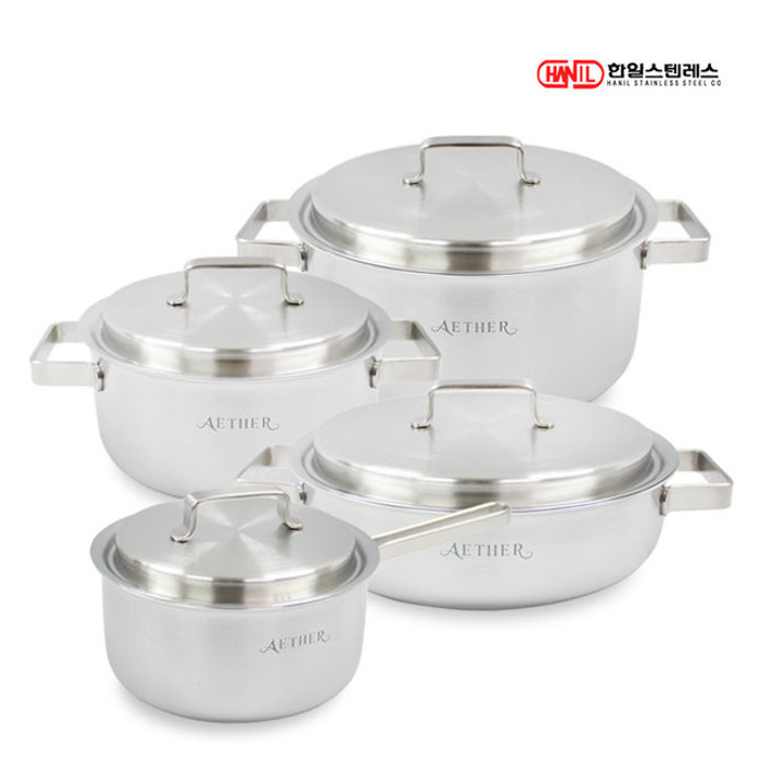 한일스텐레스 한일STS 에테르 통5중 스텐레스304 IH 인덕션가능 무연마제 냄비세트 4종(편18+양20+24+전24)