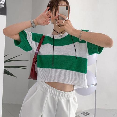 [다잇템]여자 반소매티 크롭티 박시핏 줄무늬 썸머 니트 (10368615A)