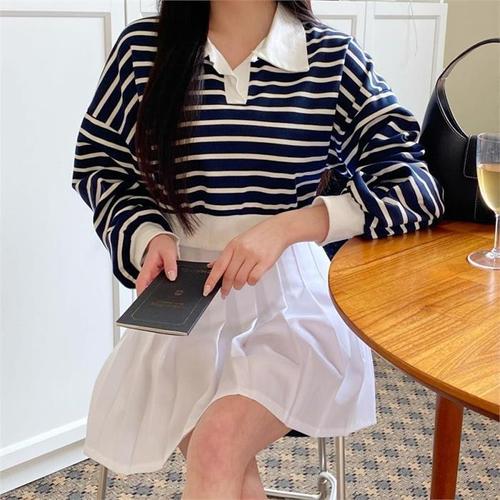 여친 니트 브이넥 봄가을 숏탑 핫걸 롱루즈핏티 크롭 스트라이프 하이웨스트 루즈핏 긴팔티 CH3