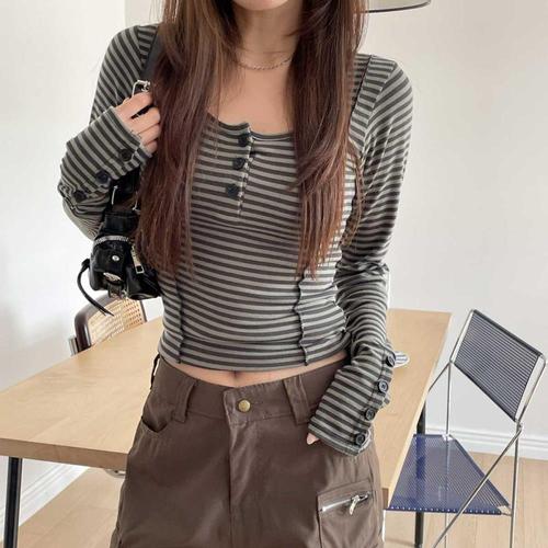 [옷자락] 여자 데일리 캐주얼 슬림핏 신축성 단가라 크롭 헨리넥 긴팔 티셔츠
