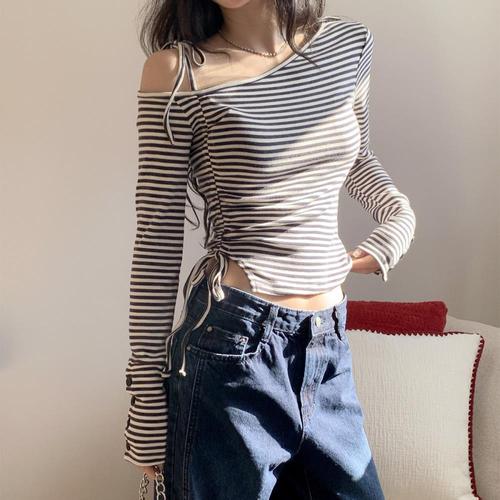 [옷자락] 여자 언발 오프숄더 스트라이프 크롭 긴팔 티셔츠