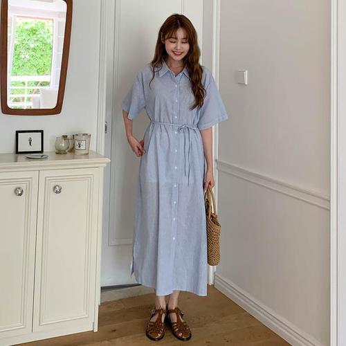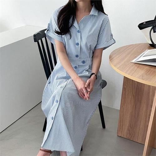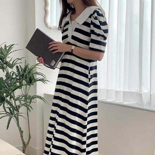 [다잇템]여자 바캉스룩 카라 줄무늬 SS 반소매 롱원피스 (10400300A)