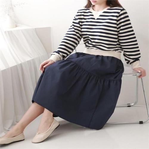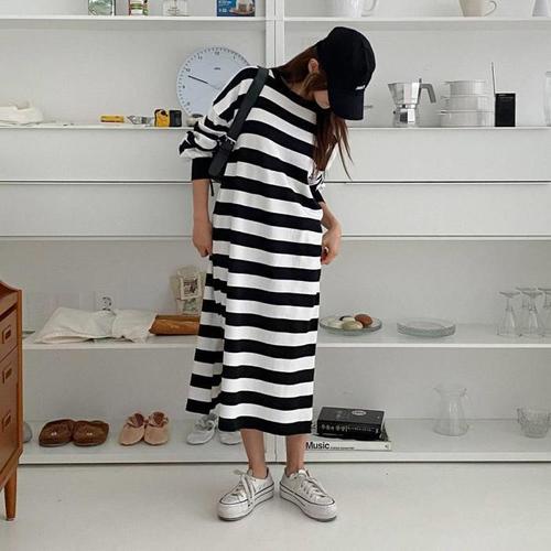 [다잇템]여자 줄무늬 티어드 긴팔맨투맨 롱원피스 (9076665A)