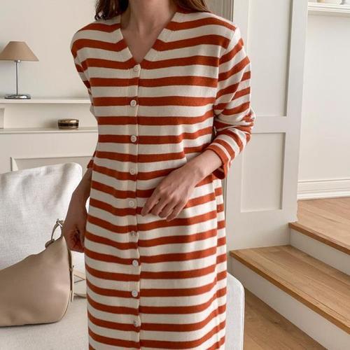 [다잇템]여자 줄무늬 롱가디건 단추 H라인 FW 롱원피스 (11148802A)