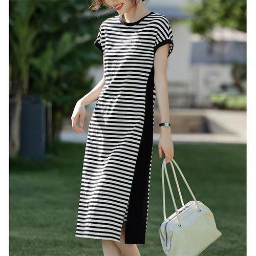[에이치플러스몰]여자 여름 쿨한 스트라이프 반팔 롱원피스