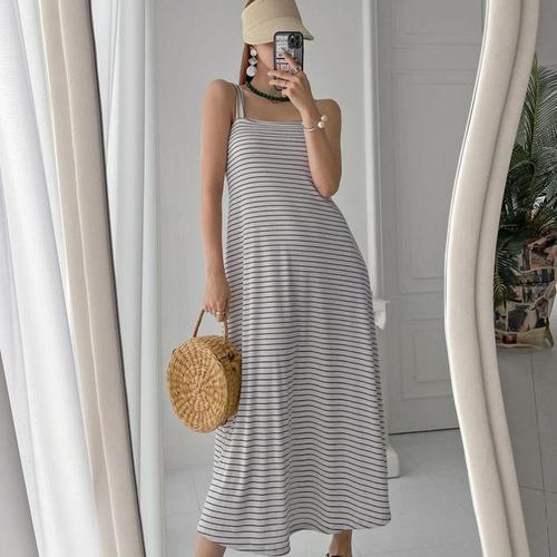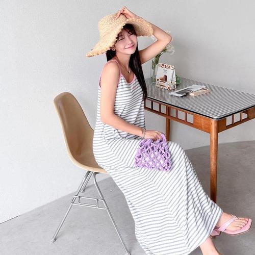 [다잇템]여자 스트랩 반팔 줄무늬 롱원피스 (8566314A)