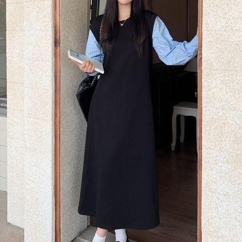 [옷자락]여자 단가라 골지 가을 홈웨어 일자핏 부클 롱원피스