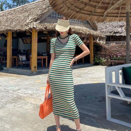 여자 컬러풀 줄무늬 여름 휴양지룩 슬림반팔 롱원피스