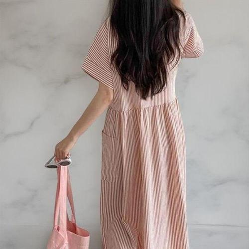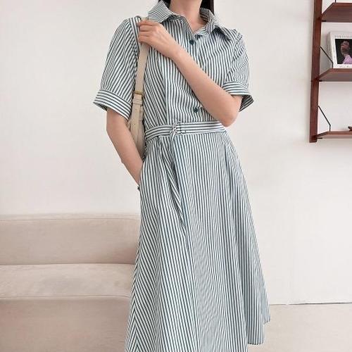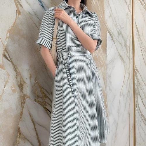 [옷자락]여자 여름 스트라이프 벨트 카라넥 반팔 핀턱 롱원피스