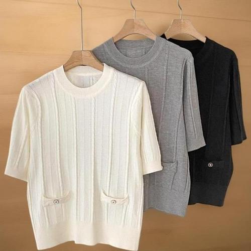 [신상오픈런]|CDT9421|여성 레이온 스트라이프 핀턱 더블 포켓 라운드넥 반팔 니트_21887200_597559