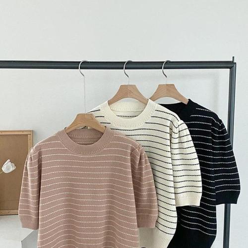 [다잇템_패션]여성 벌룬 캐쥬얼 반소매 핀턱 줄무늬 니트