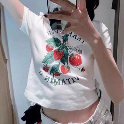 [오너클랜]인기상품 딸기 프린트 여성용 크롭 반팔 티셔츠 면 소재 [WFLKWTH_260304]