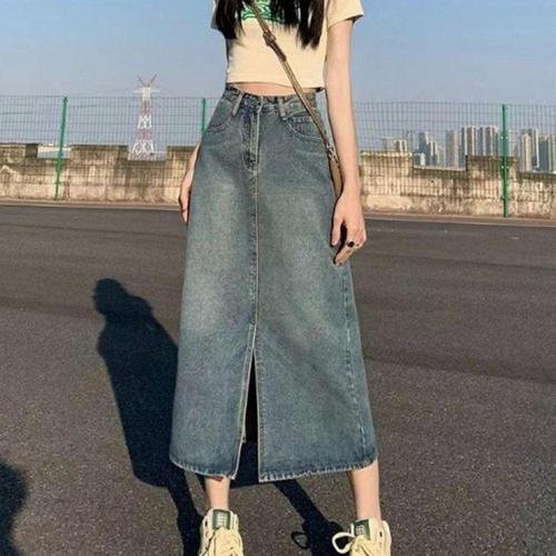 [오너클랜]인기상품 슬릿 디자인 미디 데님 스커트 트임 롱 청치마 7부 길이 스판 스커트 [WFLKX6M_260304]