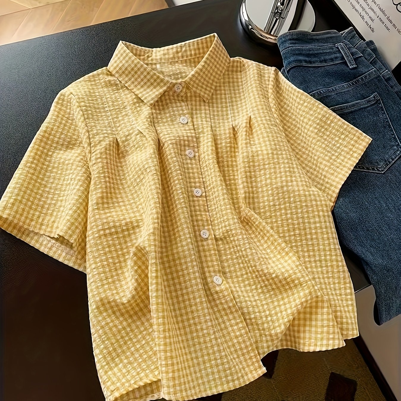 TEMU 우아한 칼라 버튼 프론트 셔츠 - 맞춤형 블라우스, 버튼 프론트 클로저, 구조적 핏, 사계절 착용, 사무실, 정장 및 반정장 복장용 - (세탁기 사용 가능, 단색, 신축성 없는 소재)