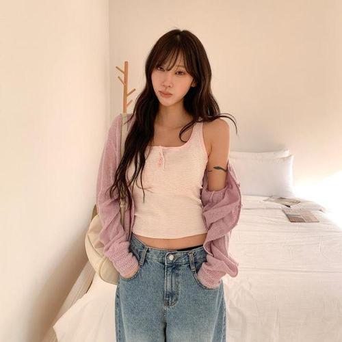 [다잇템]여자 면스판 줄무늬 슬림 캡내장 탱크 나시