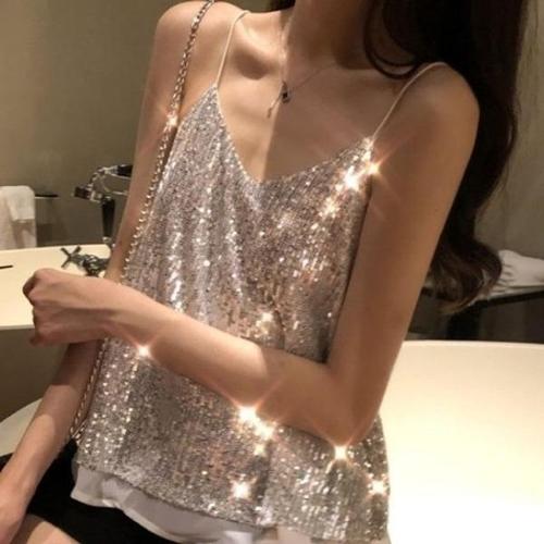 여성 스팽글 솔리드 슬림 나시 패션 캐주얼 민소매 상의