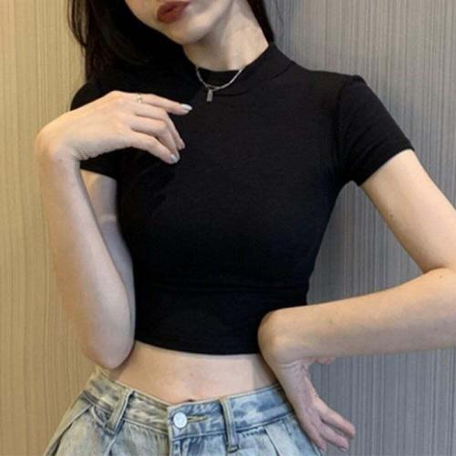 [오너클랜]인기상품 블랙 하이넥 크롭 반팔 스포츠웨어 조깅 댄스용 티셔츠 [WFLI0QH_260227]