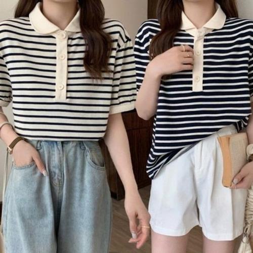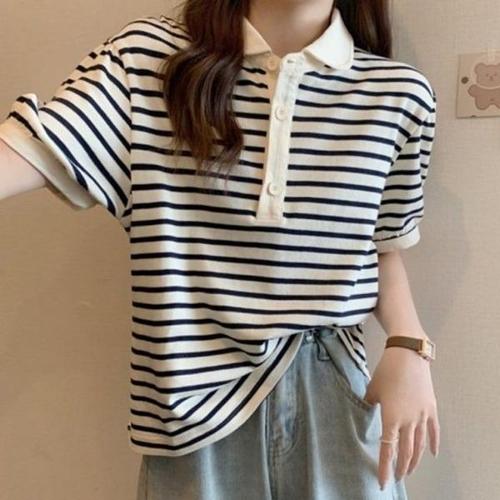 여성 스트라이프 브이넥 데일리 줄무늬 반팔 티셔츠